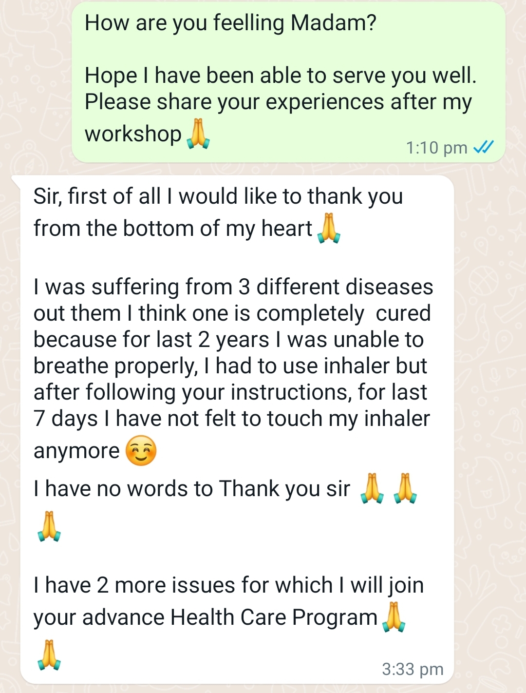 "আপনার নির্দেশ মেনে আমার মনে হচ্ছে আমার শ্বাসকষ্ট একেবারেই ঠিক হয়ে গেছে"